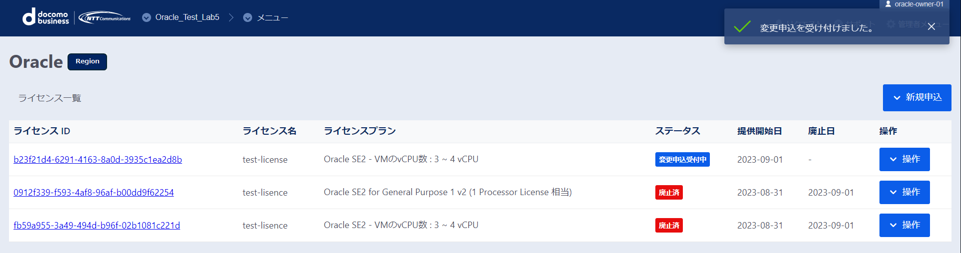 画面上部に「変更申込を受け付けました。」というダイアログが表示され、ライセンス画面に戻ります。