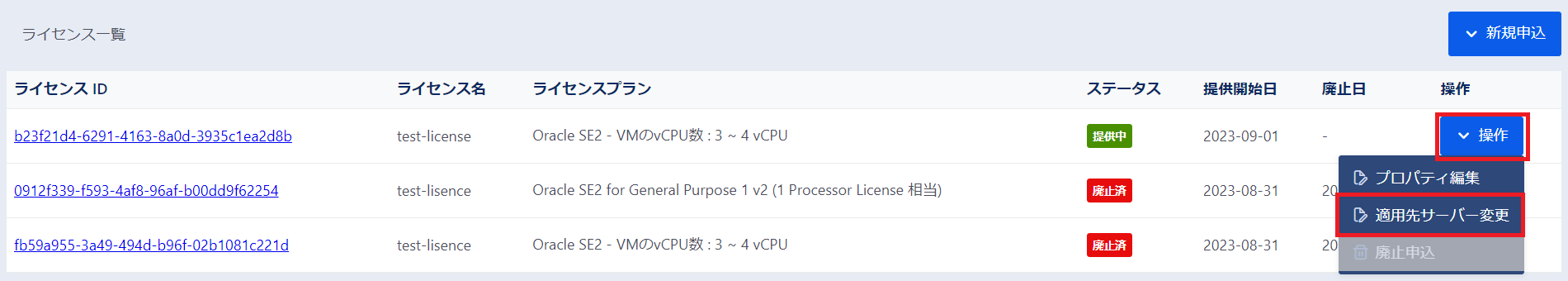Oracleの「ライセンス一覧」画面にて、変更したいライセンスを選択し、「操作」-> 「適用先サーバー変更」を押下します。