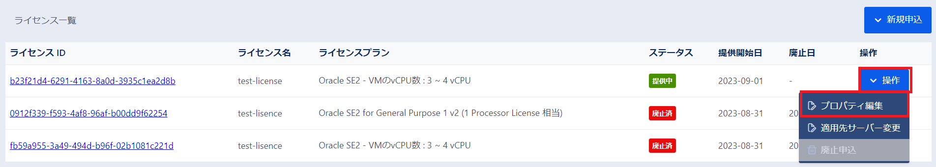 Oracleの「ライセンス一覧」画面にて、変更したいライセンスを選択し、「操作」-> 「プロパティ編集」メニューを押下します。