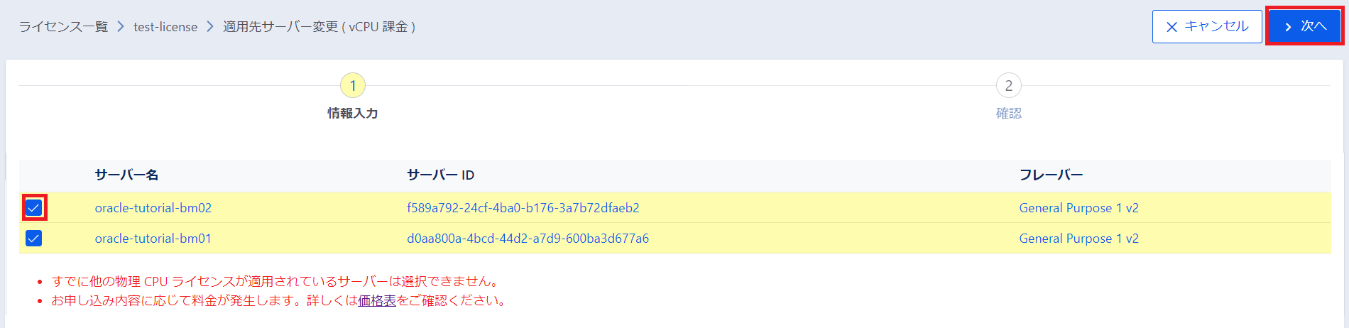 複数のベアメタルサーバーに跨ってライセンスを適用したい場合は、複数のベアメタルサーバーを選択して下さい。