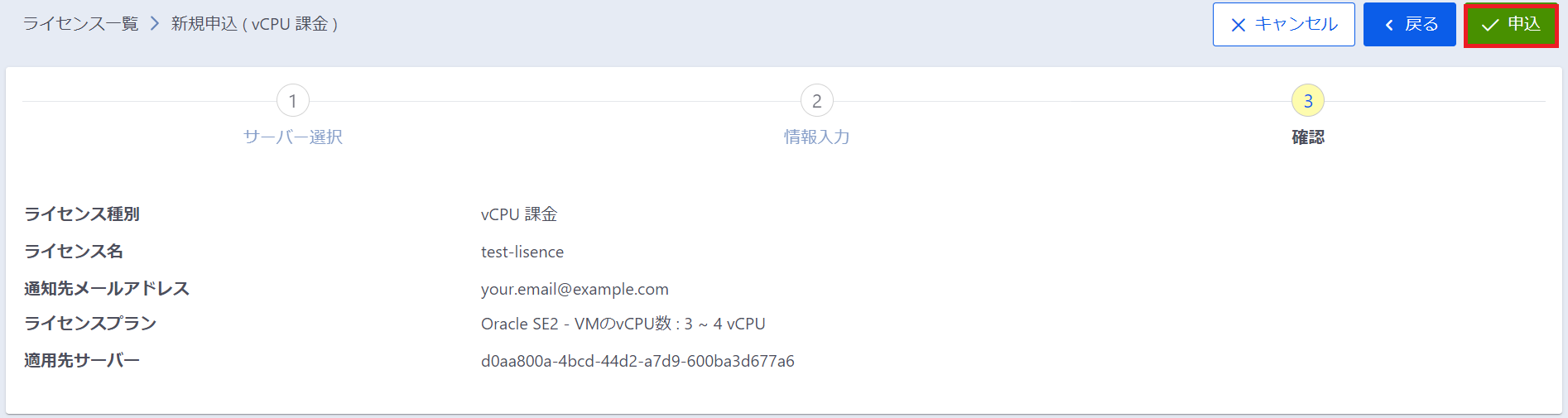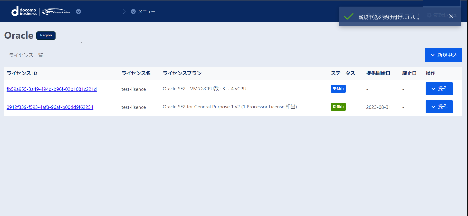 画面上部に「新規申込を受け付けました。」というダイアログが表示され、ライセンス画面に戻ります。