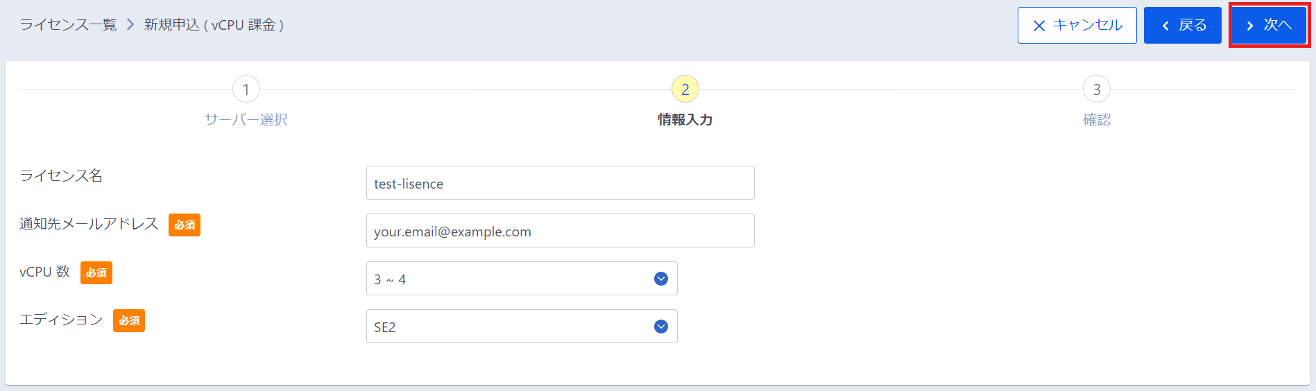 ライセンス名、通知先メールアドレスの編集画面に遷移します。編集したい項目を編集し、「次へ」ボタンを押下します。