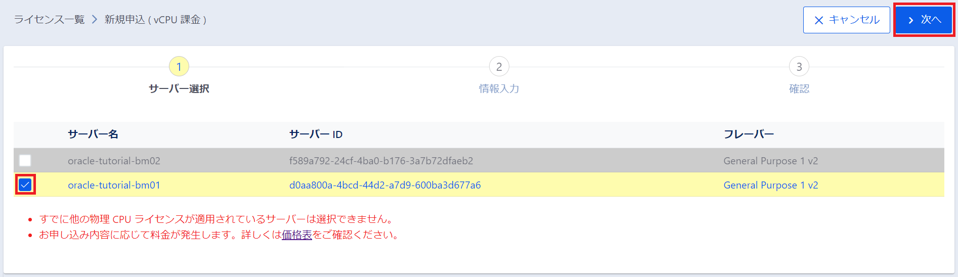 申込元テナント配下のベアメタルサーバーの一覧が表示されます。適用先とするサーバーを選択し、「次へ」ボタンを押下します。