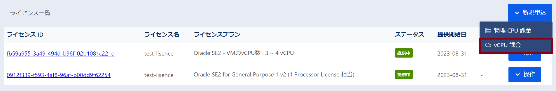 Oracleの「ライセンス一覧」画面にて、「新規申込」->「vCPU課金」メニューを押下します。