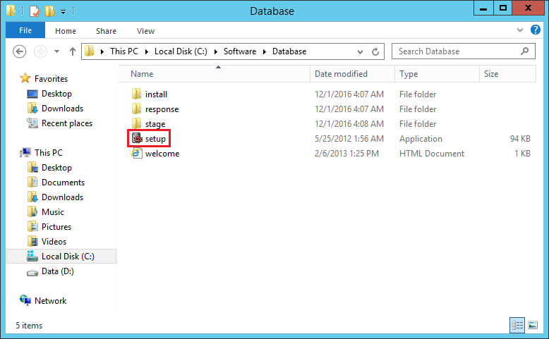 C:\Software\Database 内の setup.exe をダブルクリックし、インストーラーを起動します。