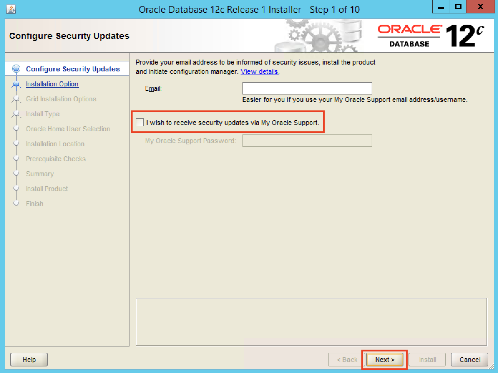 [Configure Security Updates] ウィンドウで、 [I wish to receive security updates via My Oracle Support.] のチェックを外します。