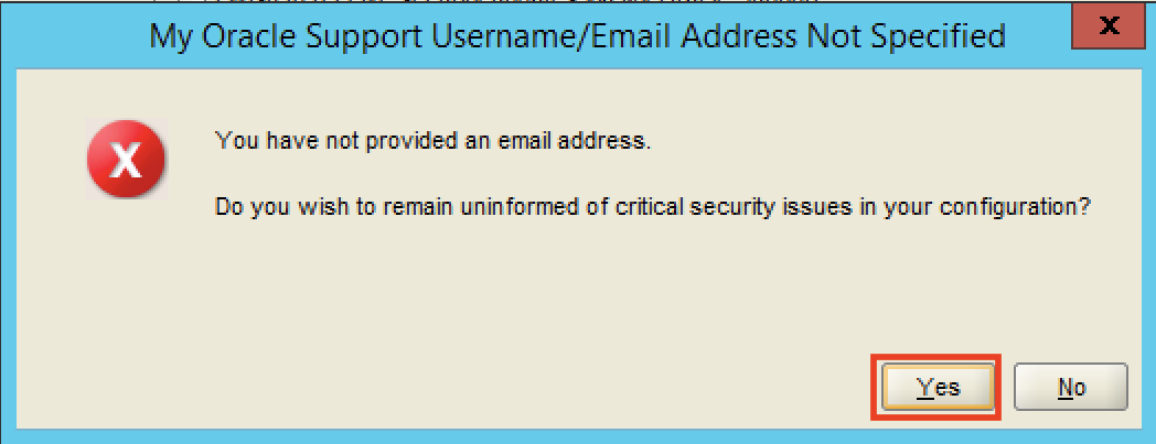 [My Oracle Support Username/Email Address Not Specified] ウィンドウで、 [Yes] を選択します。