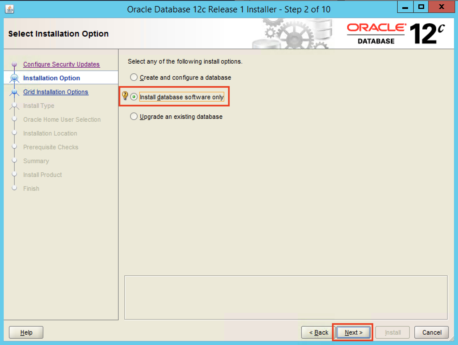 [Select Installation Option] ウィンドウで、 [Install database software only] を選択します。