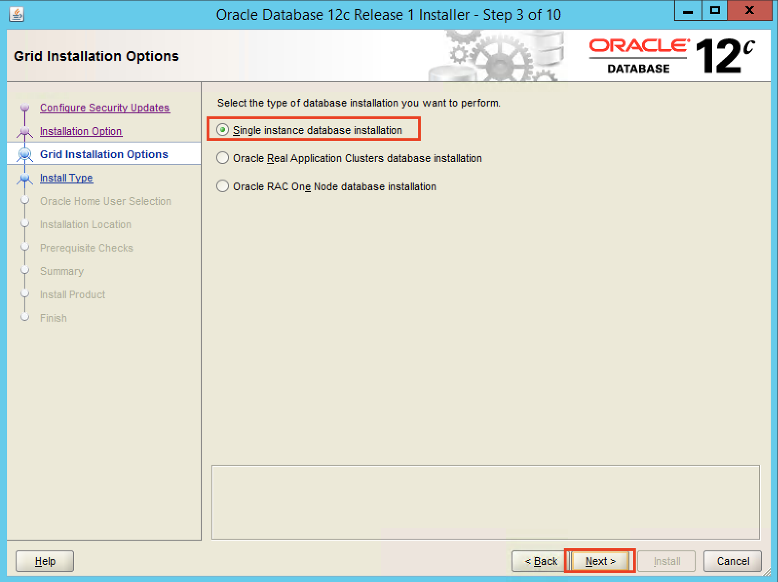 [Grid Installation Options] ウィンドウで、 [Single instance database installation] を選択します。