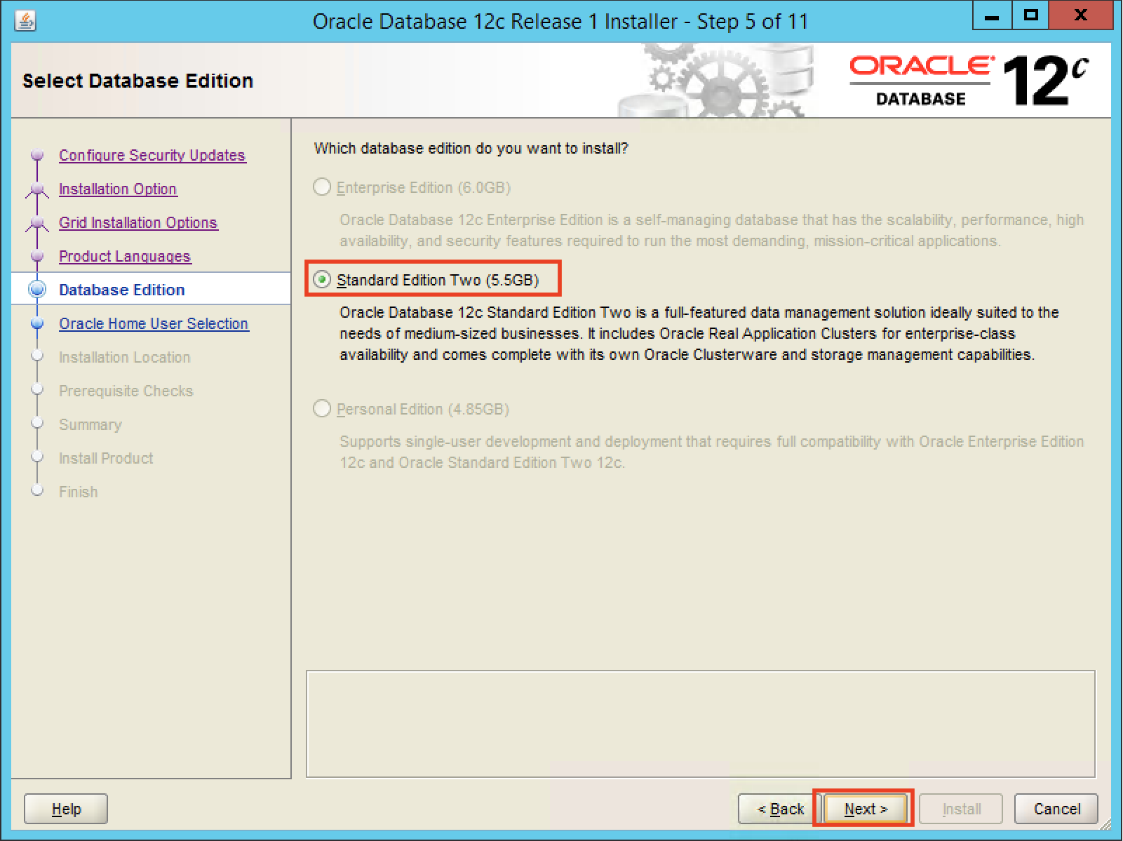 [Select Database Edition] ウィンドウで、 [Standard Edition Two] を選択します。