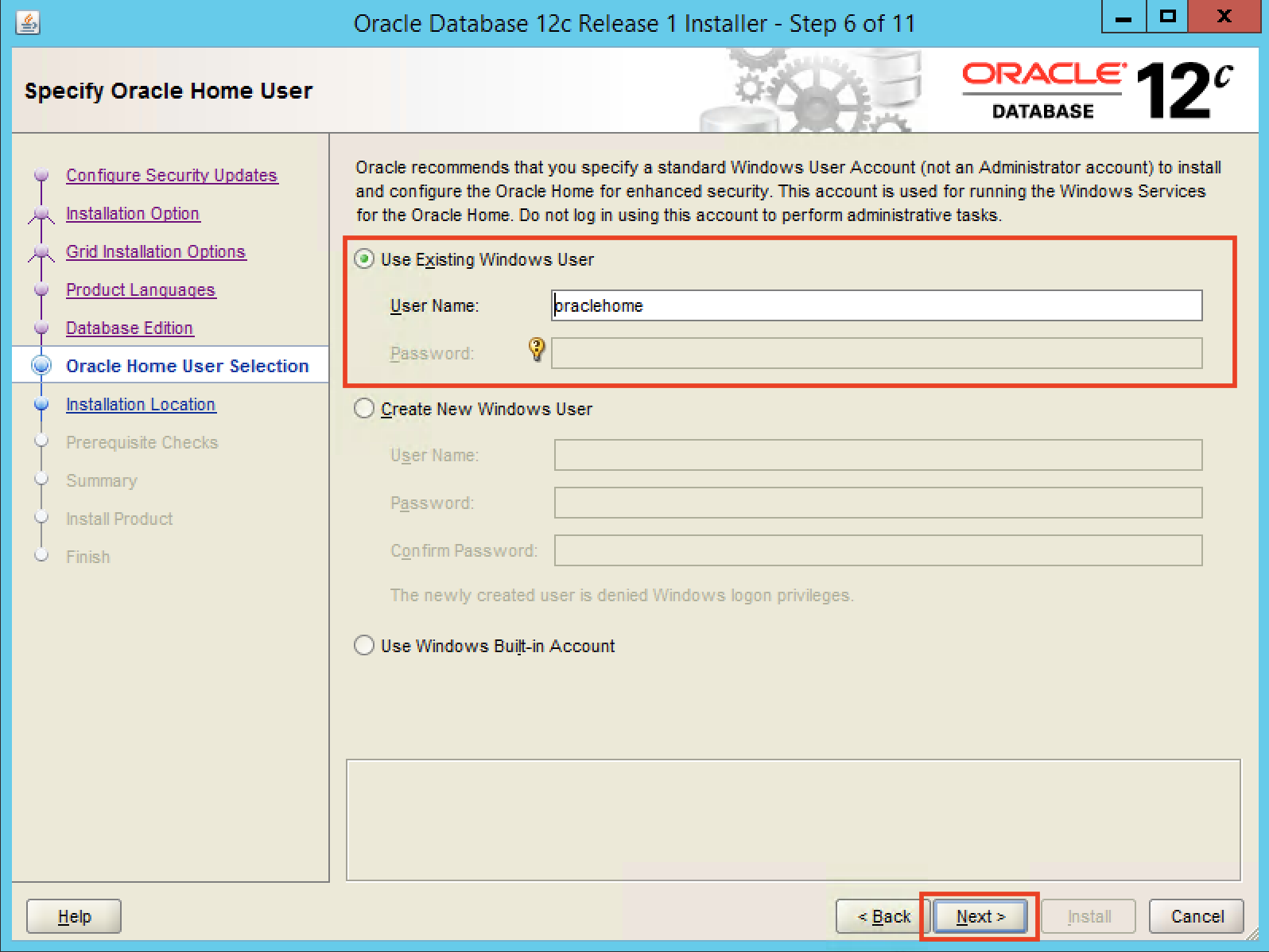 [Specify Oracle Home User] ウィンドウで、以下の項目を入力します。