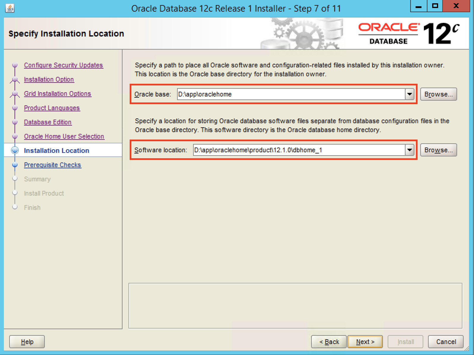 [Specify Installation Location] ウィンドウで、 以下の値を選択します。