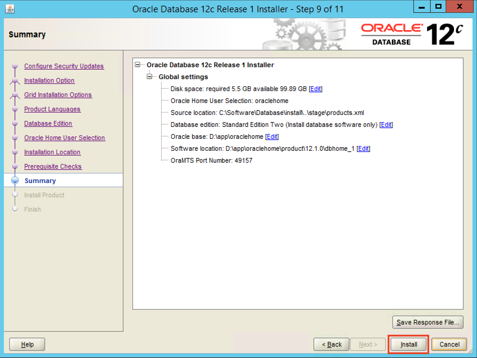 [Summary] ウィンドウで、設定を確認し、 [Install] を選択します。