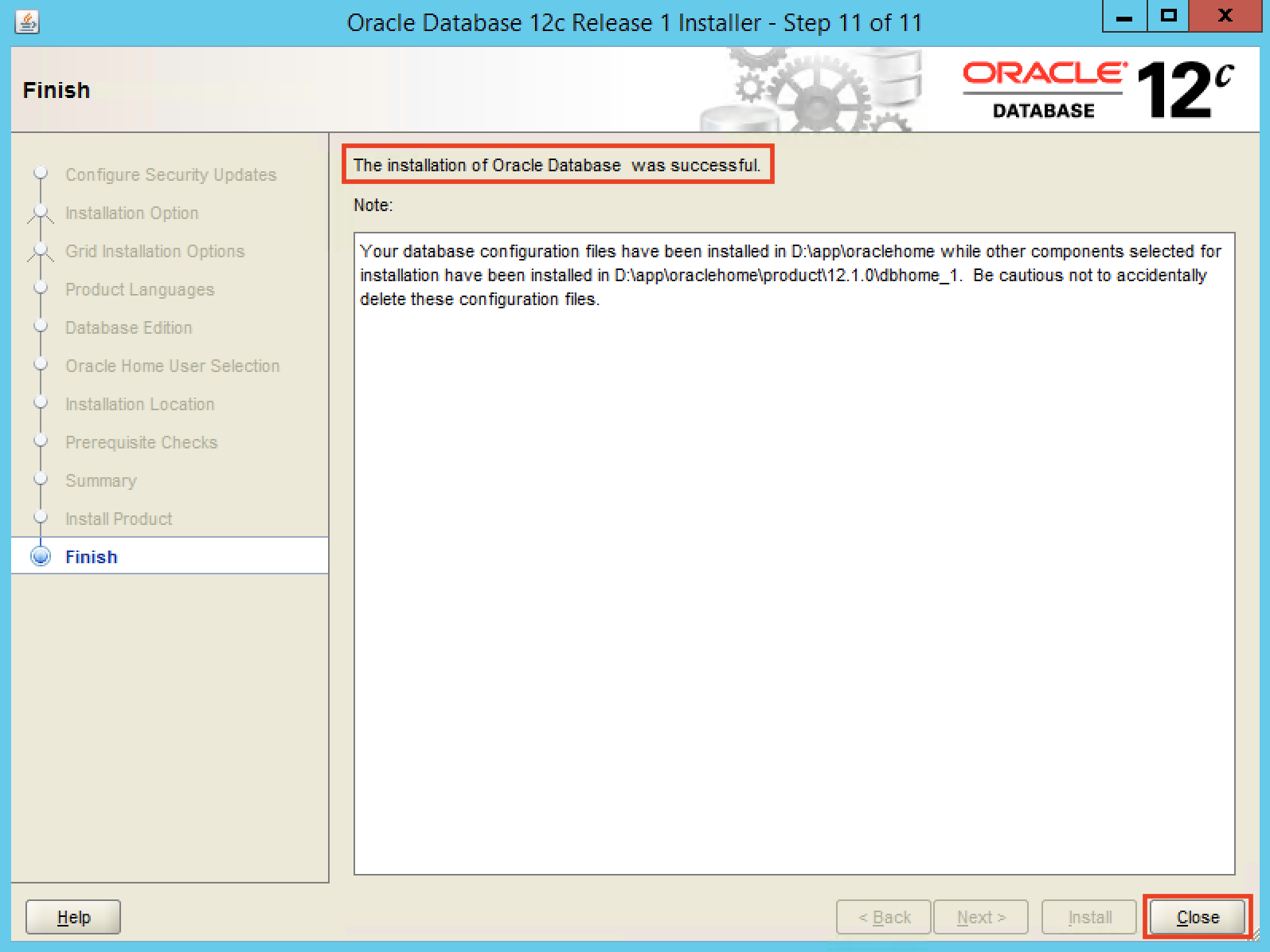[Finish] ウィンドウで、 [The installation of Oracle Database was successful.] を確認し、 [Close] を選択します。