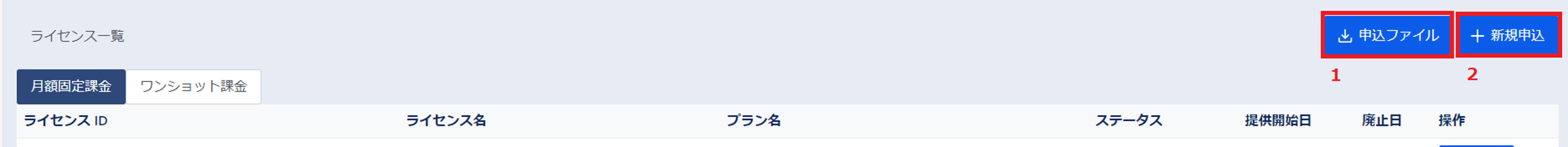 3. 申込内容確認画面にて申し込み内容を確認後、「申込」ボタンをクリックすると申し込みが完了し、ライセンス一覧画面に遷移します。