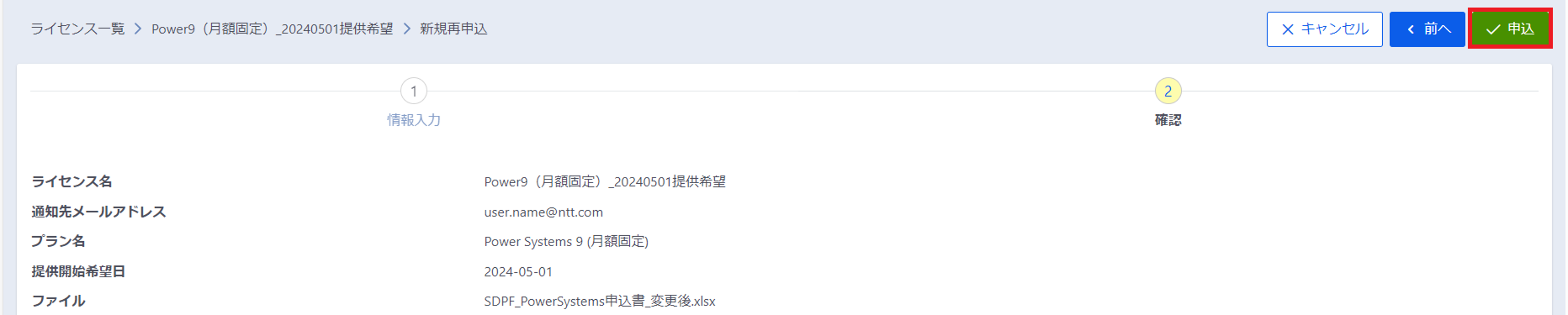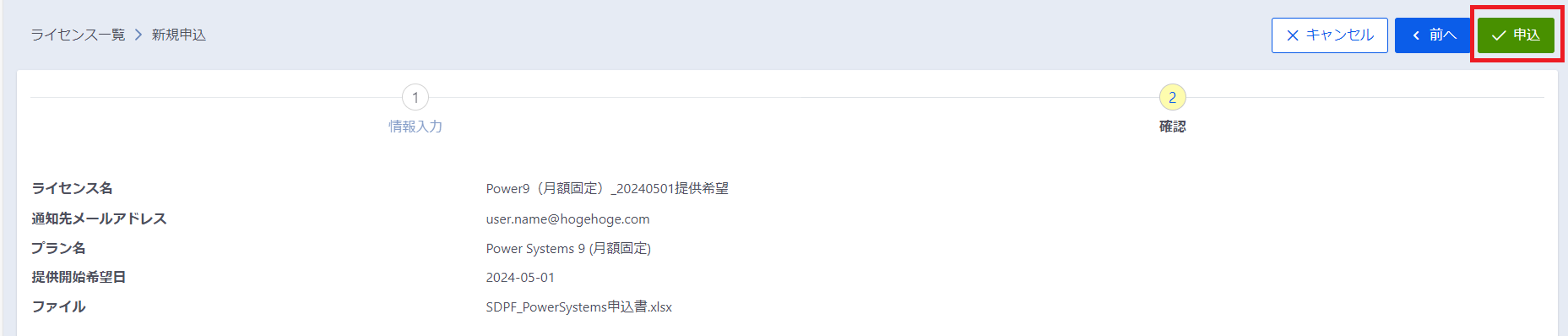 4. 申込内容確認画面にて申し込み内容を確認後、「申込」ボタンをクリックすると申し込みが完了し、ライセンス一覧画面に遷移します。