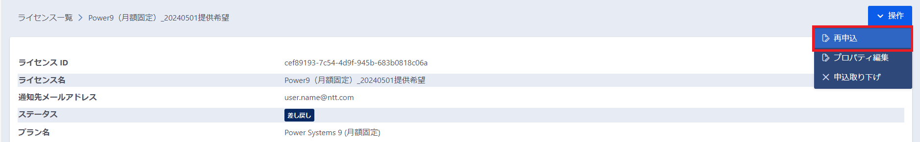 申し込みに不備があった時は、通知先メールアドレスへ不備理由を記載したメールを送付し、ライセンスのステータスが"差し戻し"に更新されます。内容を確認の上、再度申し込みをお願いします。