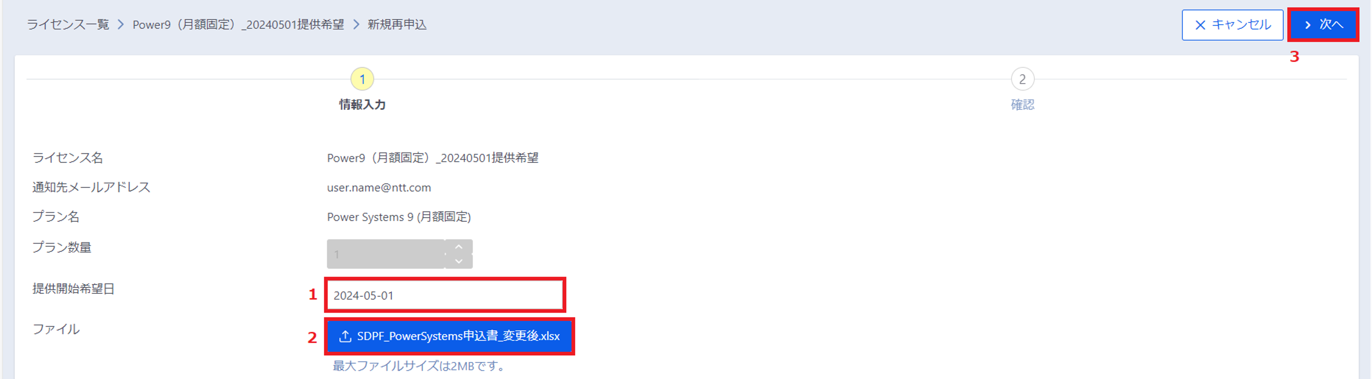 2-1)提供開始希望日欄に、対象ライセンスの提供希望日を入力。翌月以降の未来日も、選択月を変更することで選択可能となります
