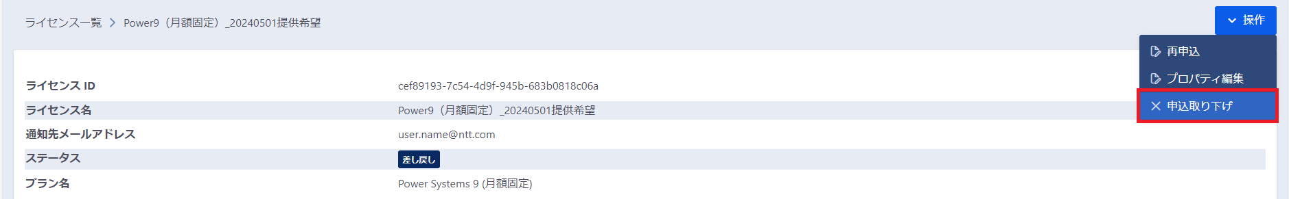 なお、ライセンスのステータスが"差し戻し"の申し込みのみ取り下げが可能です。