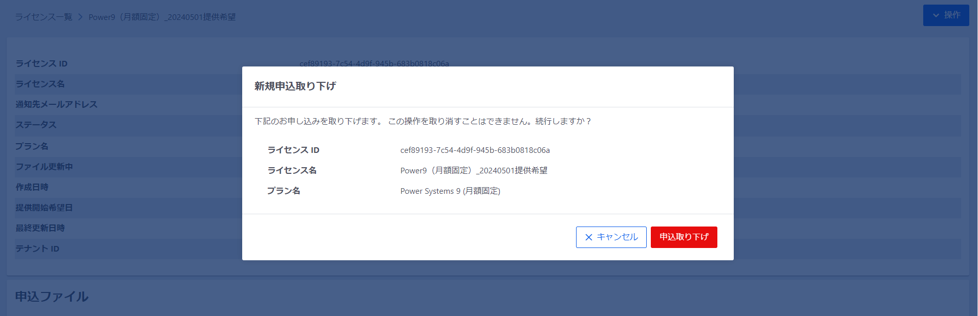 3. 内容に問題がなければ「申込取り下げ」ボタンをクリックすると取り下げが完了し、ライセンス一覧画面に遷移します。