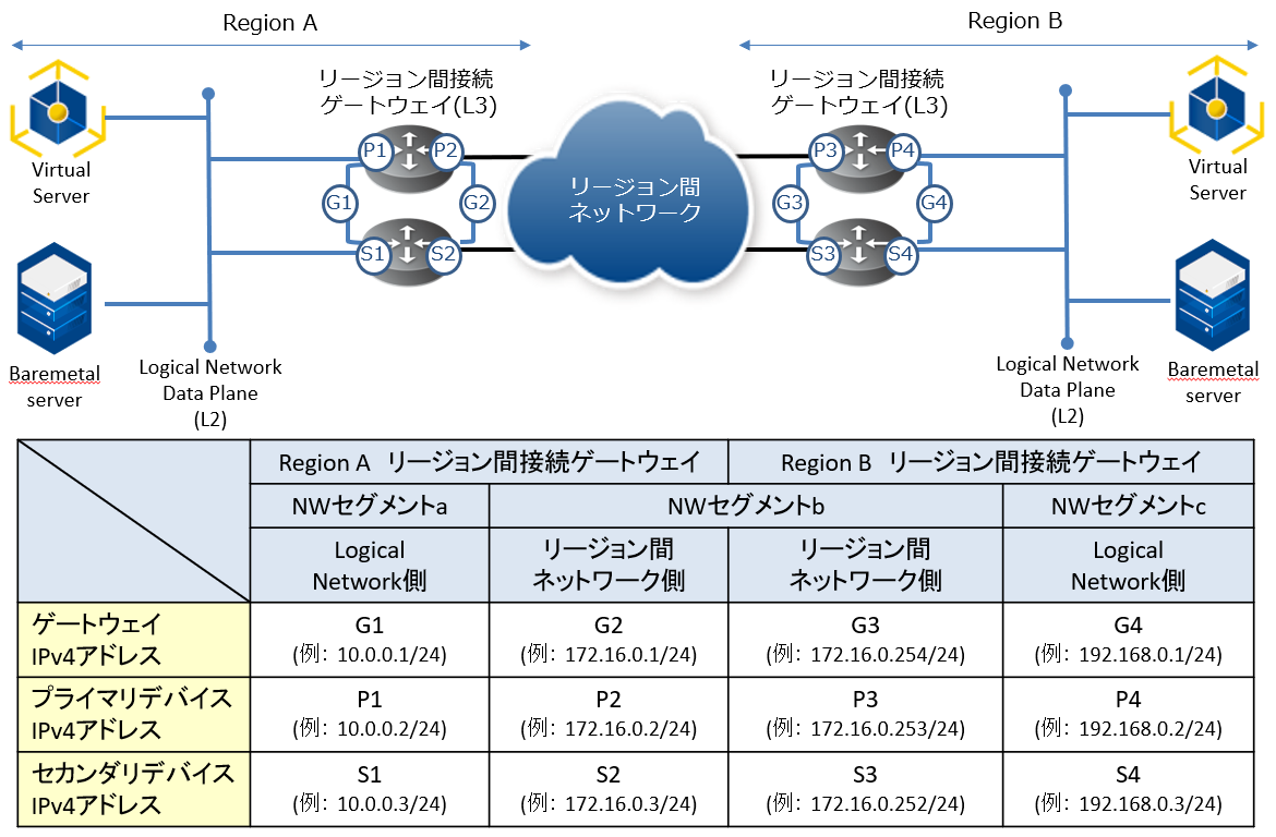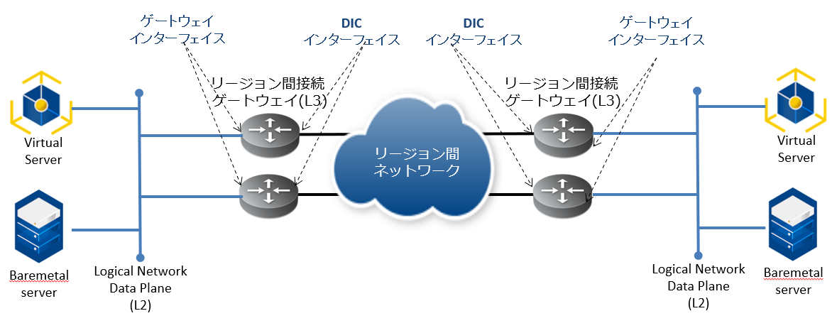 リージョン間ネットワークは広域L2ネットワークとして提供されます。各リージョンのDICインターフェイスのアドレスは同一セグメントから払い出してください。