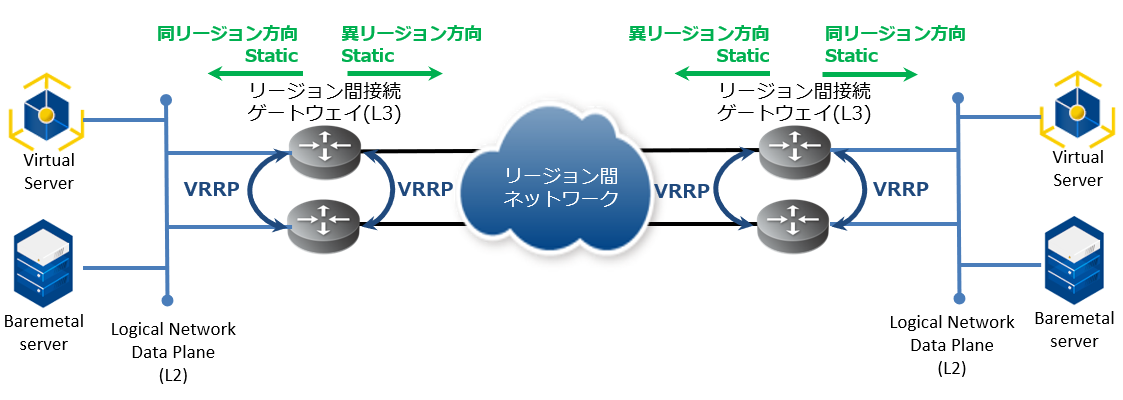 リージョン間ネットワークは広域L2ネットワークとして提供されます。同リージョン方向(ロジカルネットワーク向け)・異リージョン方向(リージョン間ネットワーク向け)にスタティックルートを設定する必要があります。
