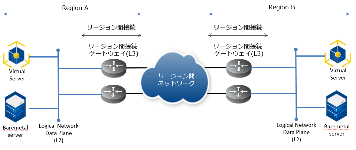 複数リージョンから接続可能なリージョン間L2ベストエフォートバックボーン(リージョン間ネットワーク)と、各リージョンから接続するためのL3ゲートウェイを提供します。