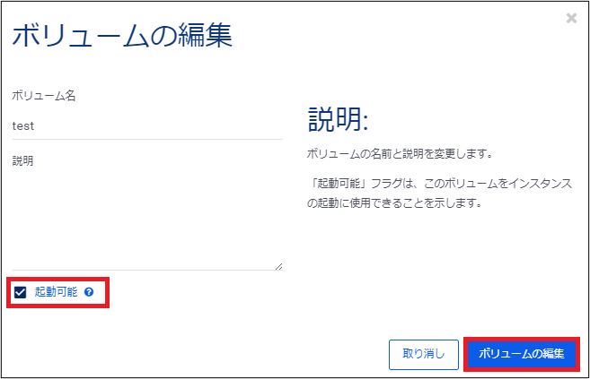 インスタンスからボリュームが正常に切断されたことを確認したら、そのボリュームから新規インスタンスを作成できるように、ボリュームの属性をブータブル (起動可能状態) に変更します。変更にあたっては、「ボリュームの編集」を選択します。
