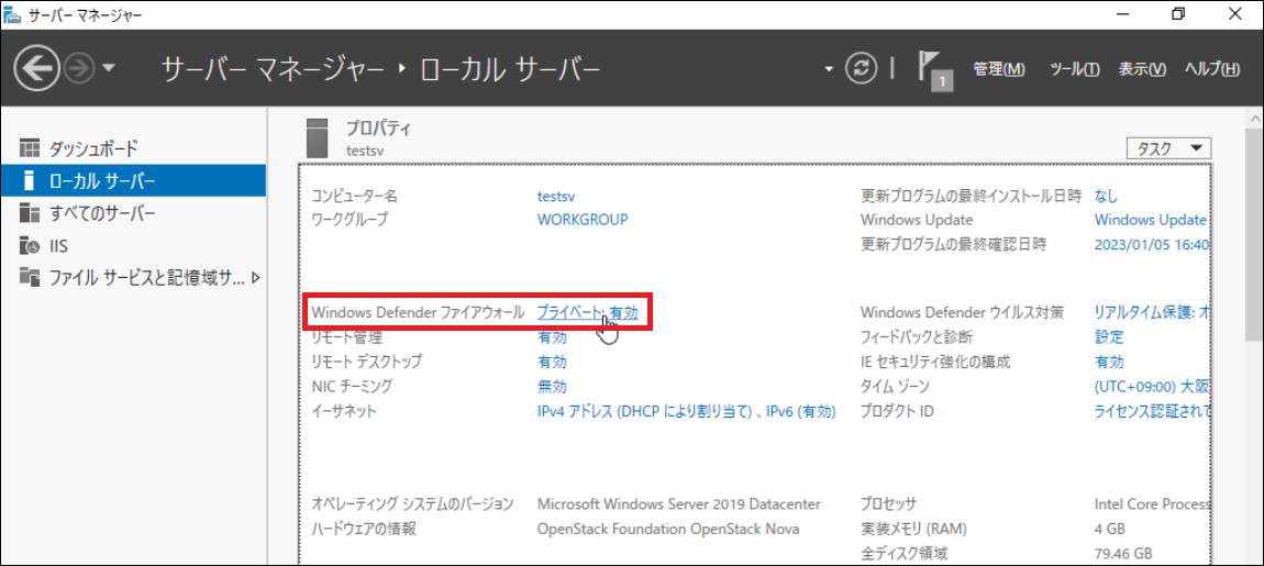 [サーバマネージャ]-[ローカルサーバ]を開いて設定を確認します。リンクをクリックして設定画面を開きます。