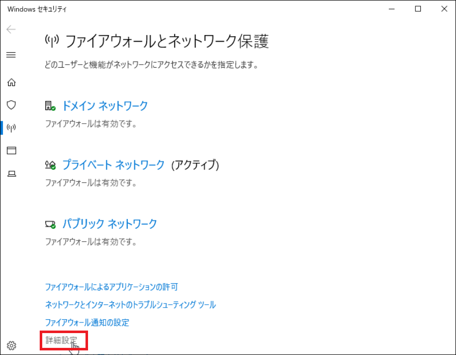 2.Windowsファイアウォール設定画面が開いたら、詳細設定をクリックします。