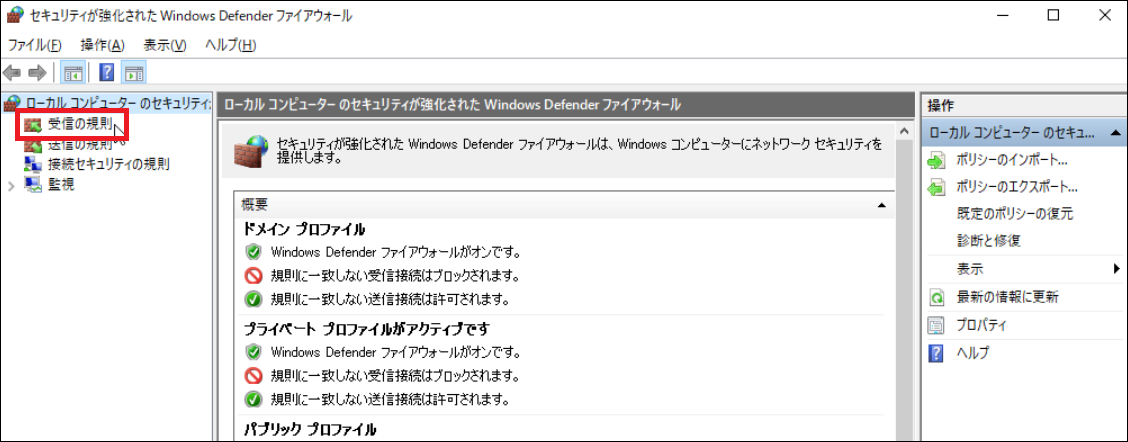 3.Windowsファイアウォールの詳細設定画面で受信の規則をクリックします。