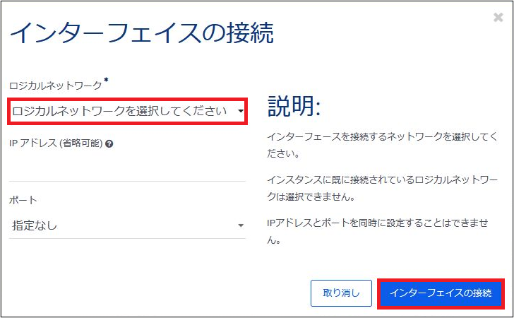 実行すると、「インターフェイスの接続」画面が表示されますので、「ロジカルネットワーク」、「IPアドレス」、「ポート」を指定します。