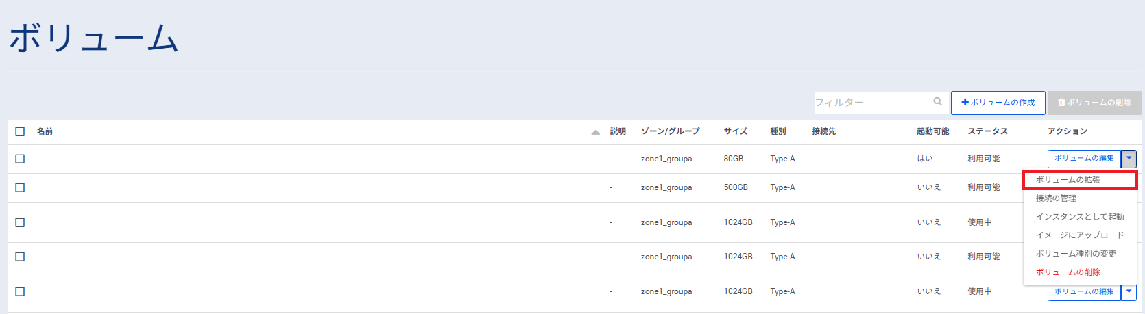 ここでは、作成済ボリュームのサイズを拡張する方法について説明いたします。