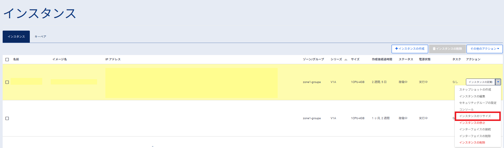基盤状況により、本処理が完了するまでに数時間を要する場合があるため、変更作業には余裕をもってご実施ください。 インスタンス起動状態でも本操作を実行可能ですが、本操作の処理の過程でインスタンスの再起動が実行されます。リサイズの実行前に、データ等の保存を実施してください。