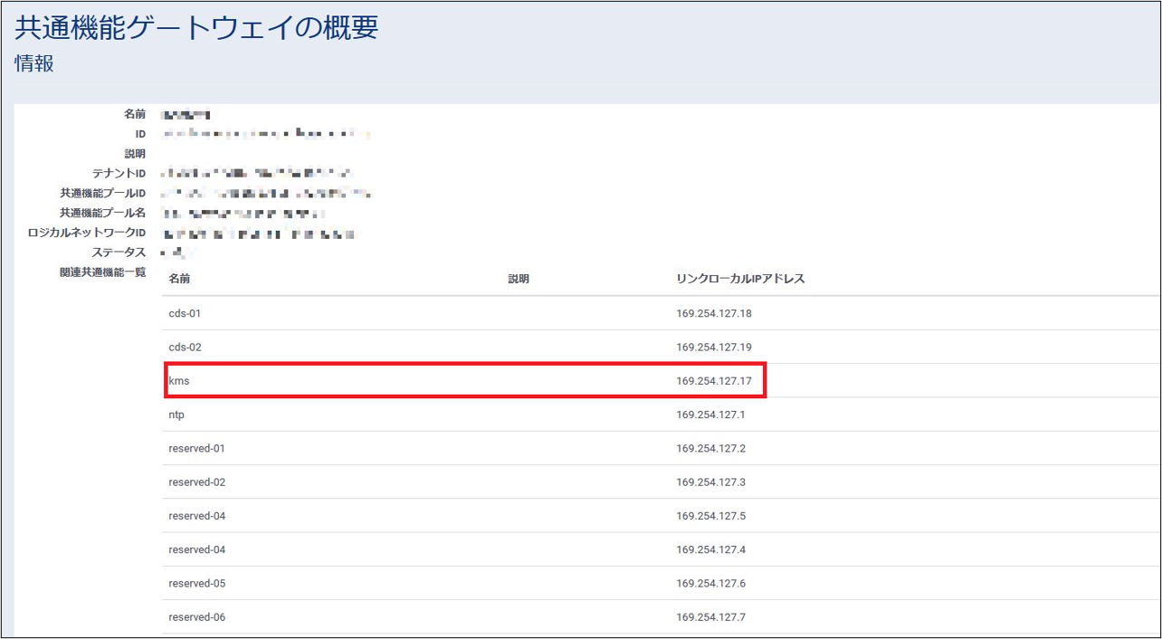 ネットワークインターフェイスの接続が完了したら、ライセンス認証サーバーへの疎通確認を実行します。ライセンス認証サーバーのアドレスは、共通機能ゲートウェイの詳細から確認でき、KMSと書かれている箇所がIPアドレスとなります。