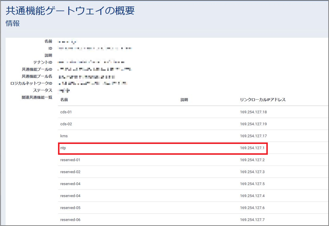 ネットワークインターフェイスの接続が完了したら、NTPサーバーへの疎通確認を実行します。NTPサーバーのアドレスは、共通機能ゲートウェイの詳細から確認できます。