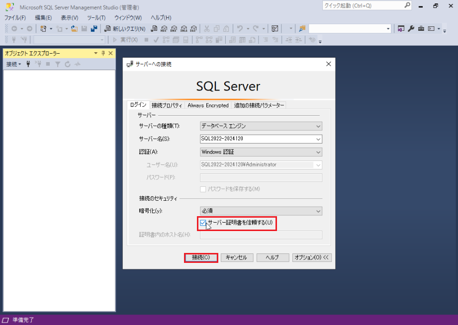 SSMSバージョン 20.2.30は「接続のセキュリティ」の「サーバーの証明書を信頼する」にチェックを入れてください。
