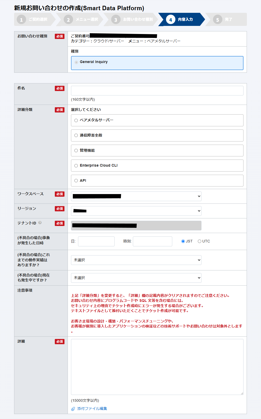 チケット作成途中で「詳細分類」のプルダウンを変更すると、それまで「詳細」に記載されていた内容がクリアされてしまいますので注意してください。