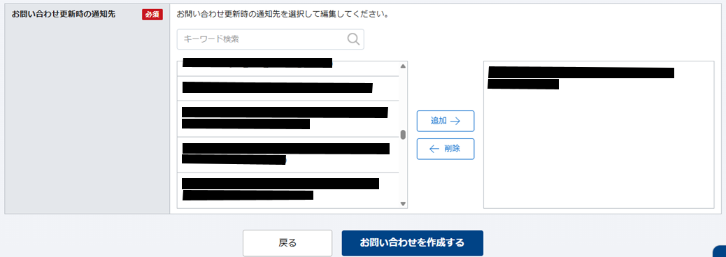 お問い合わせ更新時の通知先は、下図のように追加・削除したいユーザーを選択し、画像中央の「追加」「削除」を押すことで編集できます。