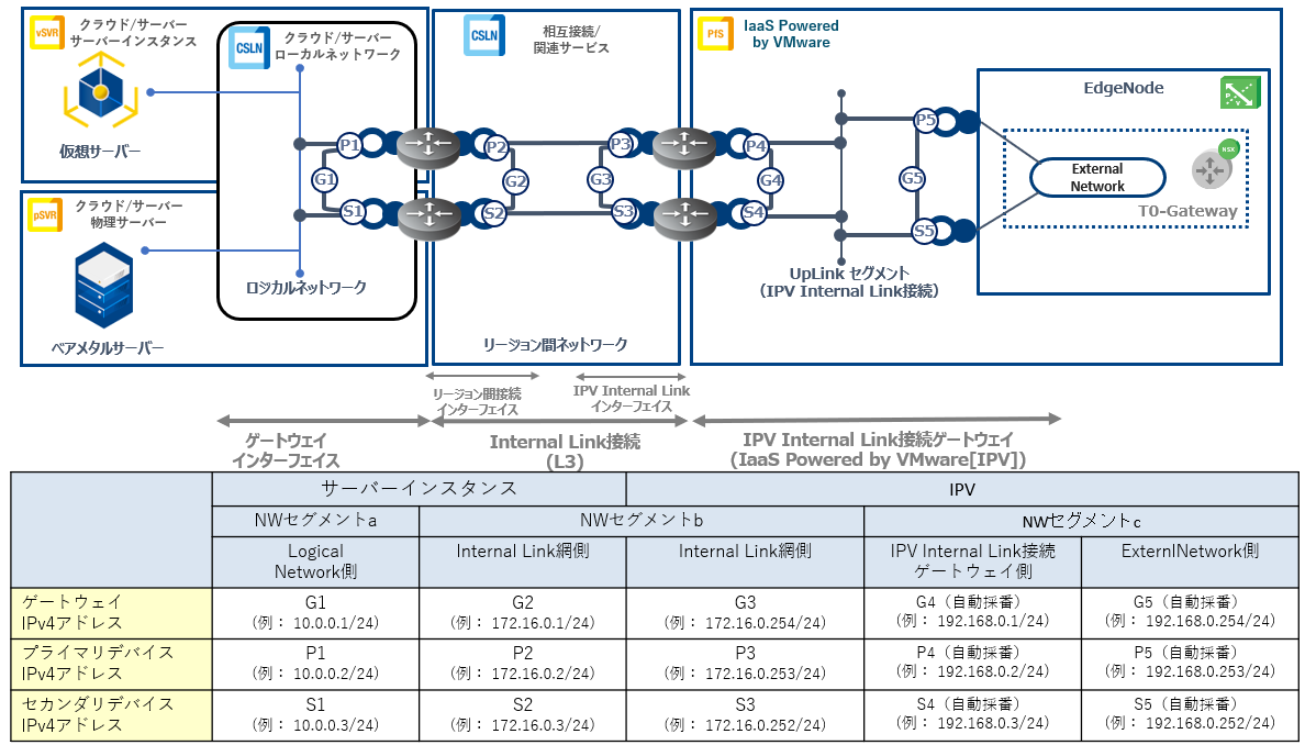 - リージョン間接続インターフェイスのゲートウェイIPv4アドレス、プライマリIPv4アドレス、セカンダリIPv4アドレス(アドレス設定項の図:G2/P2/S2)