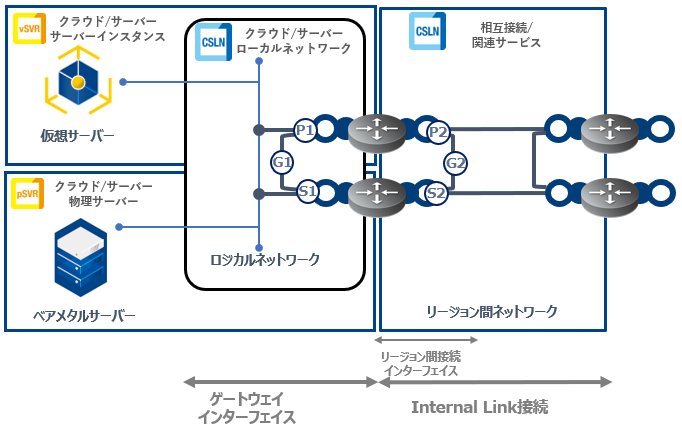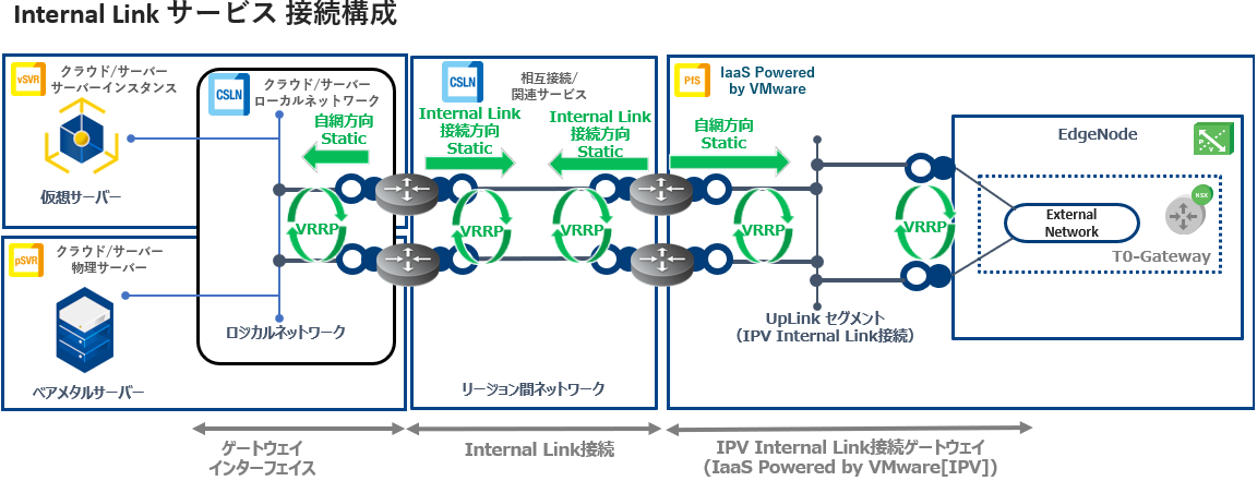 - お客さま専用の冗長化された仮想ルーター(IPV側:IPV Internal Link接続ゲートウェイ、サーバーインスタンスやベアメタルサーバー等側:リージョン間接続ゲートウェイ(L3))を提供します。