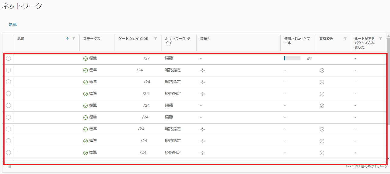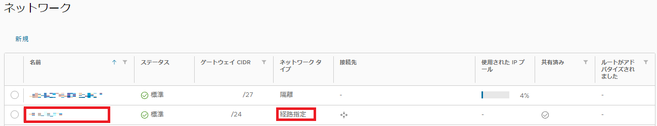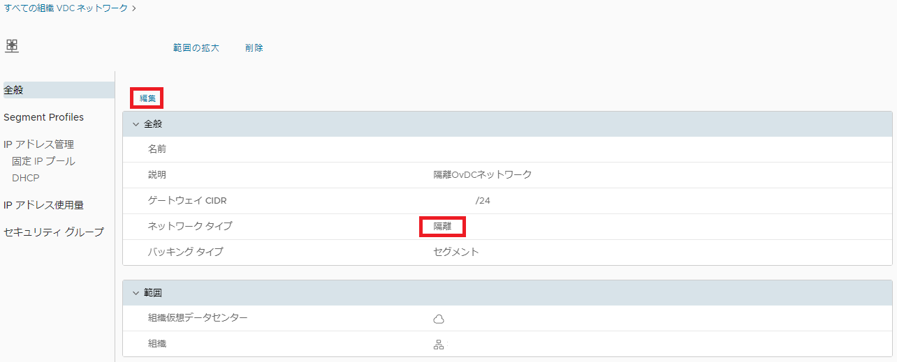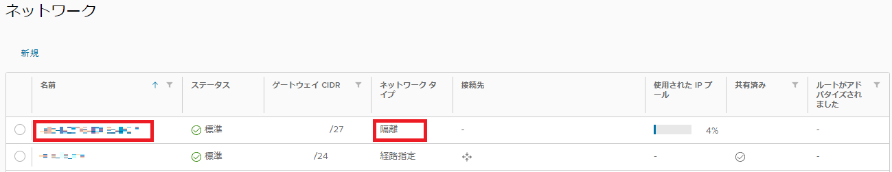 [ネットワーク] リストより、編集対象のOvDCネットワーク名をクリックします。 | この際、"ネットワーク タイプ"が「隔離」であることを確認して下さい。