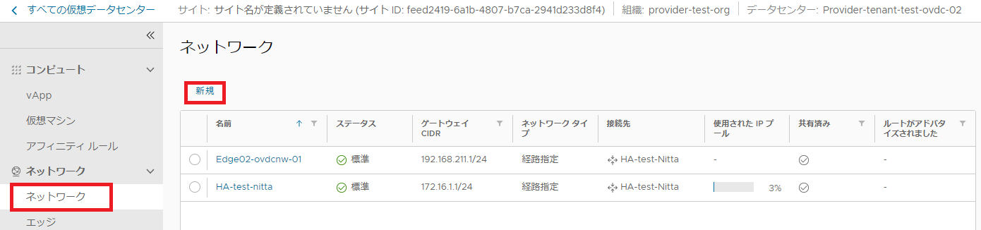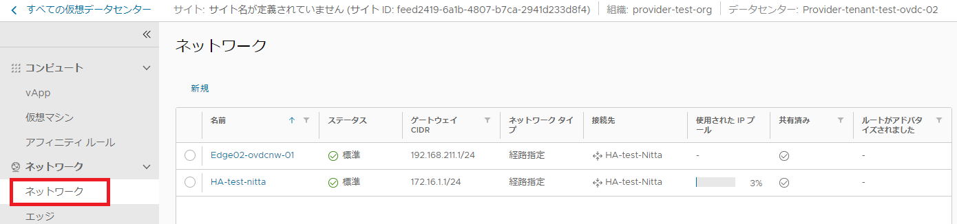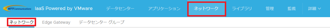 「仮想データセンター」(以下、OvDC)内、左ペインメニューより[ネットワーク]を押下します。