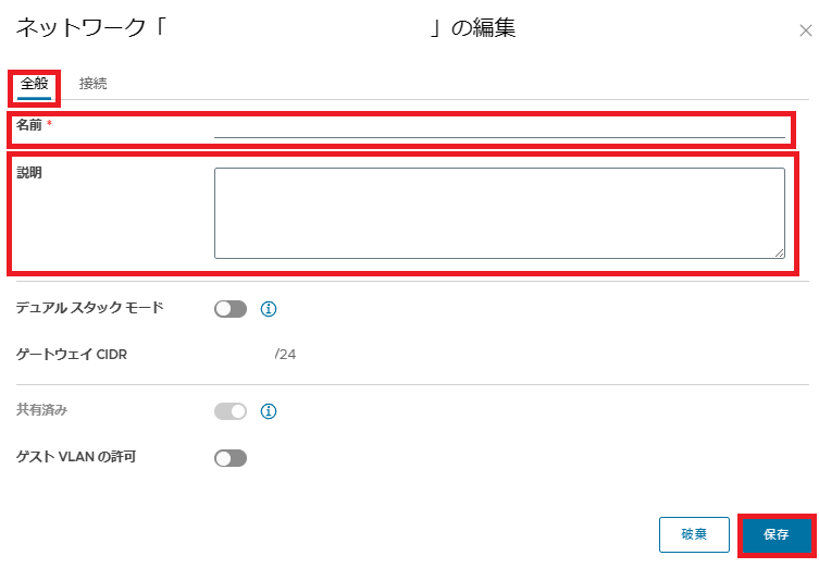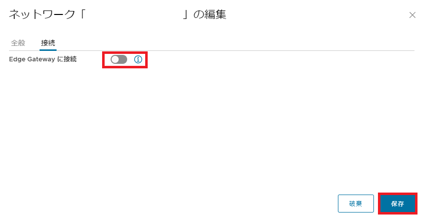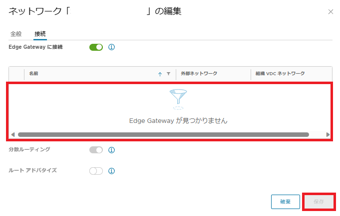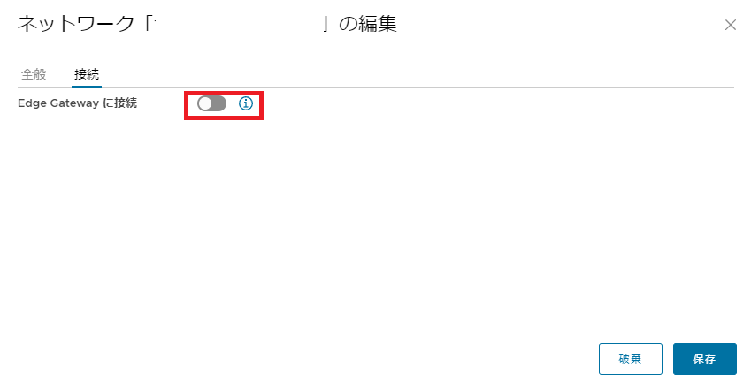 - 経路指定型OvDCネットワークを隔離型に変更します。設定項目を以下に記載します。- [Edge Gateway に接続] オプションをオフにします。