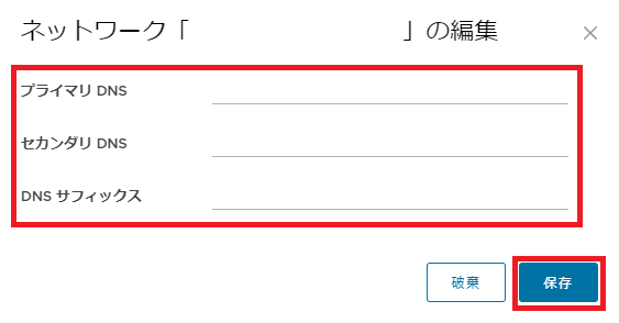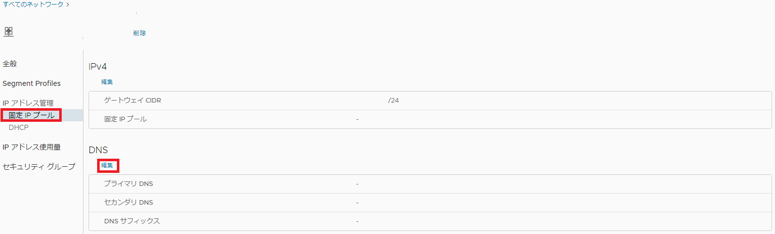 - [固定IPプール]内、「DNS」セクション上部の[編集]ボタンをクリックします。編集対象を編集します。編集可能項目はOvDCネットワークにて設定したDNS項目と同様となります。