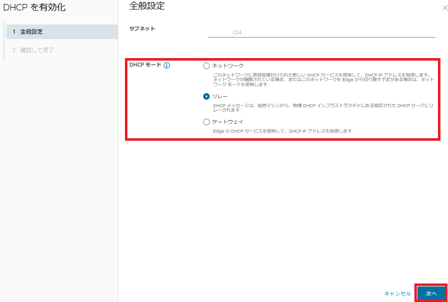 - [DHCPを有効化]ダイアログにてOvDCネットワークのDHCP設定を行います。[1 全般設定]設定項目にて"DHCP モード"を[リレー]にチェックします。設定項目内容は以下となります。