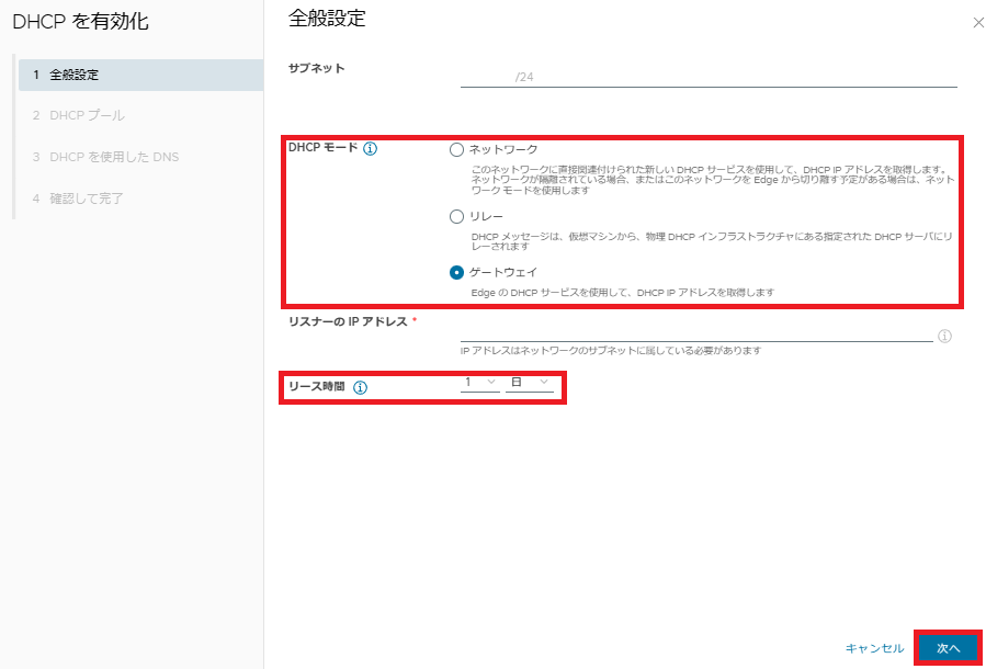 - [DHCPを有効化]ダイアログにてOvDCネットワークのDHCP設定を行います。[1 全般設定]設定項目にて"DHCP モード"を[ゲートウェイ]にチェックします。設定項目内容は以下となります。