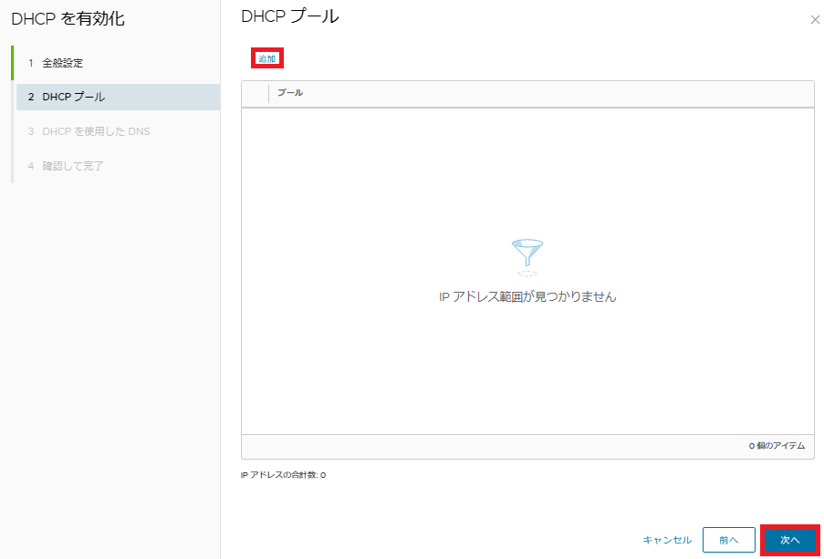 - [2 DHCPプール]設定にて画面上部[追加]をクリックします。プール欄にIPアドレス範囲を入力します。入力形式は以下となります。例)IPアドレス範囲192.168.1.2 - 192.168.1.100