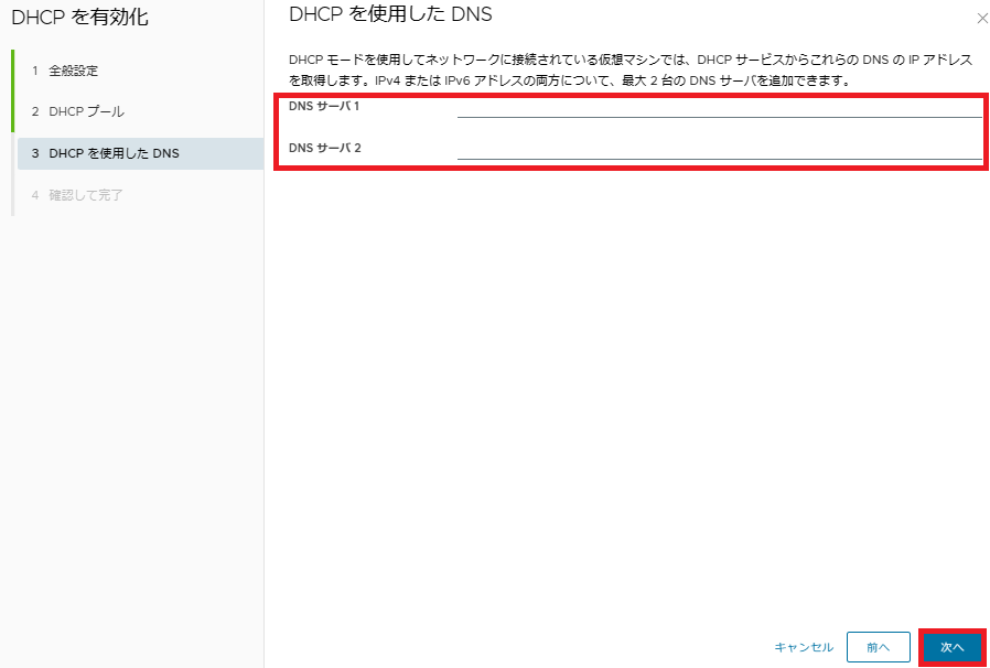 - [3 DHCPを使用したDNS]にてDHCPにて提供するDNSサーバーを設定します。最大2つのDNSサーバーを追加することができます。