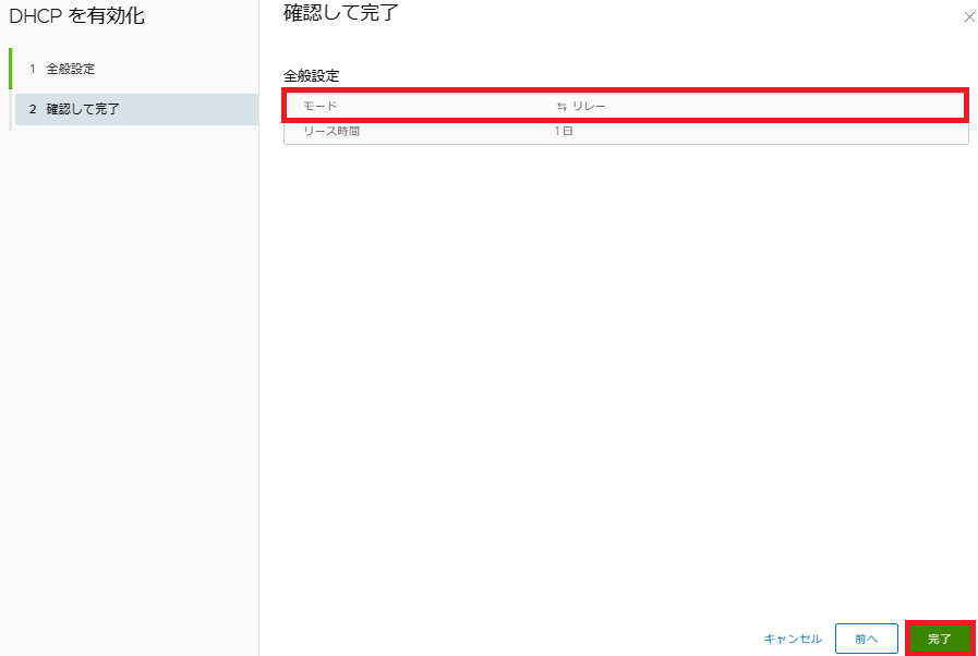 - [2 確認して完了]設定にて設定内容を確認し、[完了] をクリックします。DHCPサービス構成が有効化され、設定情報が[DHCP]内に反映されます。